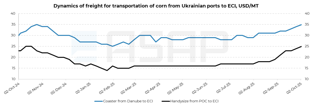 За словами Павла Лисенка, аналітика ASAP Agri та фрахтового брокера Atria Brokers, фрахтовий ринок Чорного моря входить у жовтень із тенденцією зростання у сегментах хендісайзів та коастерів. Ставки на хендісайзи піднялися ще на 1 USD/т на всіх маршрутах з України, тоді як ставки на коастери зросли на 1–2 USD/т порівняно з минулим тижнем. Варто зазначити, що попит на коастери наразі відносно вищий, ніж на судна типу хендісайз, особливо в сегменті дедвейтом 5 000–7 000 тонн. У результаті фрахтувальники змушені й надалі підвищувати свої фрахтові ідеї, щоб покрити жовтневі відправки коастерами або флотом хендісайз, тоді як ставки на панамакси залишаються переважно стабільними.