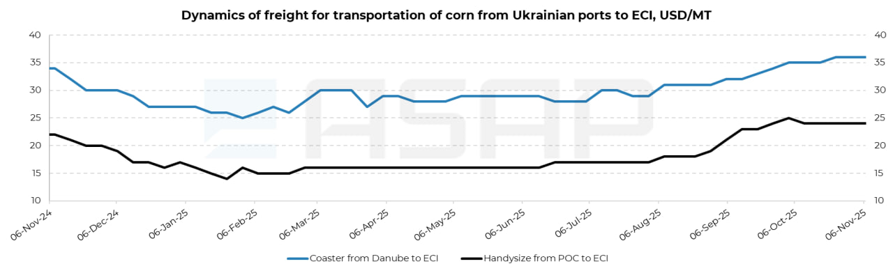 За словами Павла Лисенка, аналітика ASAP Agri та фрахтового брокера Atria Brokers, український фрахтовий ринок входить у листопад зі змішаними тенденціями. Ставки фрахту Panamax на відправки зернових з України знизилися на 1 USD/MT, тоді як ставки на Handysize залишаються стабільними, оскільки судновласники твердо відстоюють свої позиції за умов невеликого вибору тоннажу у регіоні. Тим часом нещодавній ажіотаж у сегменті костерів дещо вщух через збільшення пропозиції тоннажу. Відповідні рівні фрахту знизилися приблизно на 1 USD/MT на коротких маршрутах і відправках до Східного Середземномор’я, тоді як на інших напрямках залишаються стабільними.